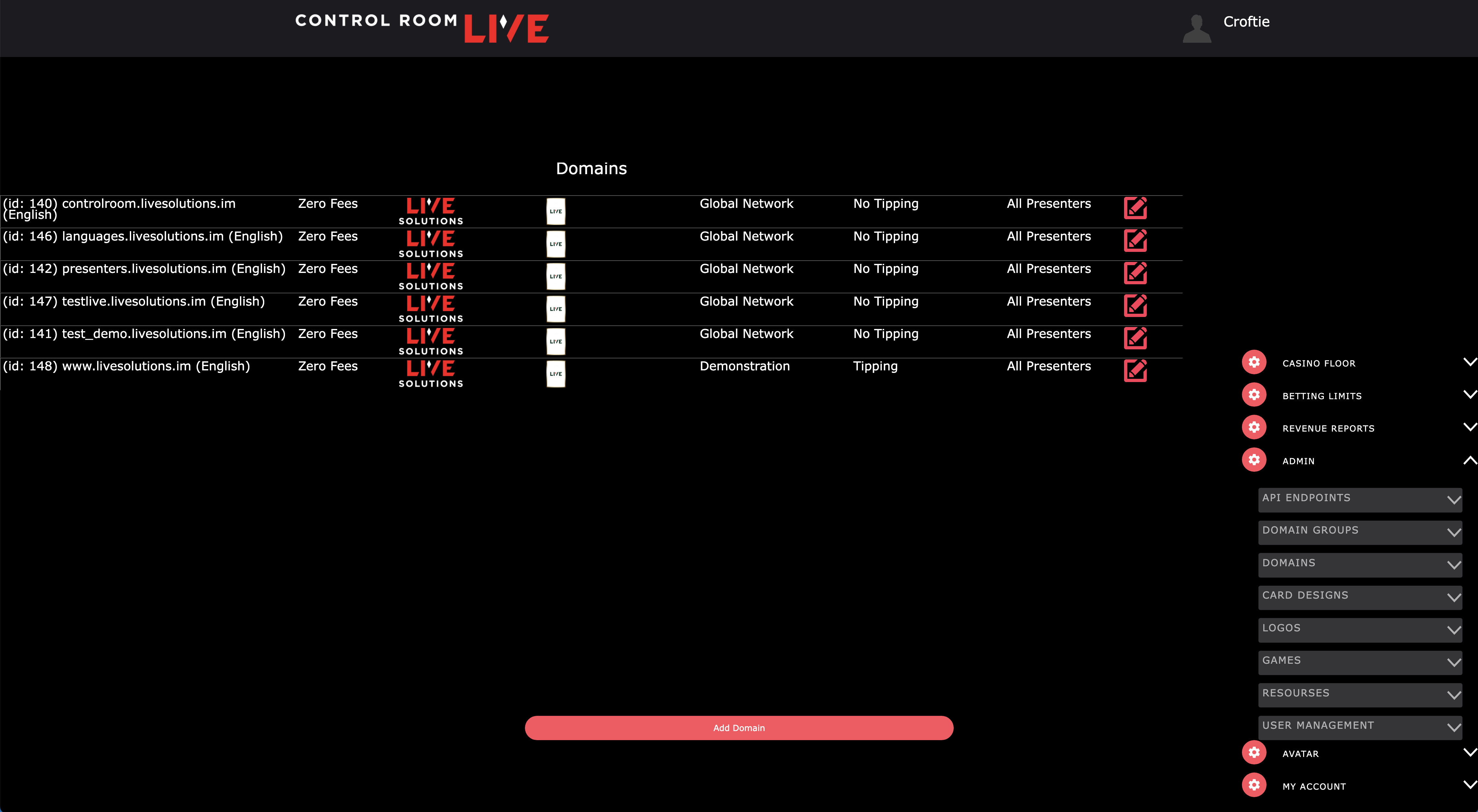 Selecting Domains initially displays a list of your existing domains which also shows the API Endpoint, Fee Scheme, logo, card back design and Domain Group associated with each domain.